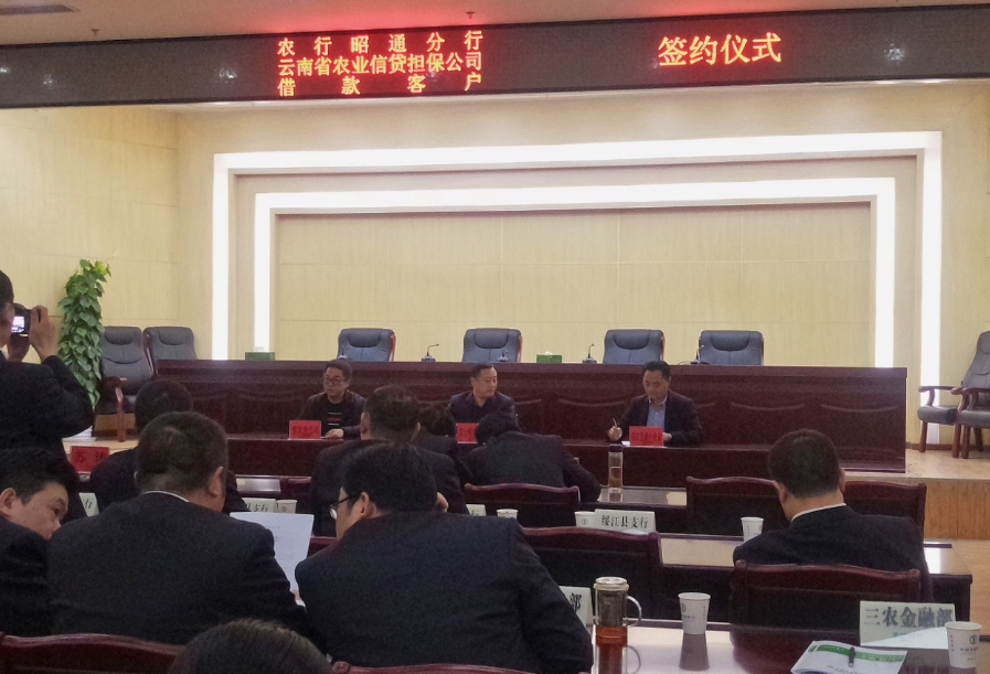 會議由農(nóng)業(yè)銀行分行三農(nóng)部負責人李國云主持,農(nóng)擔公司昭通辦事處朱磊代表公司分別與鹽津縣、綏江縣、永善縣支行行長及其借款客戶進行簽約。