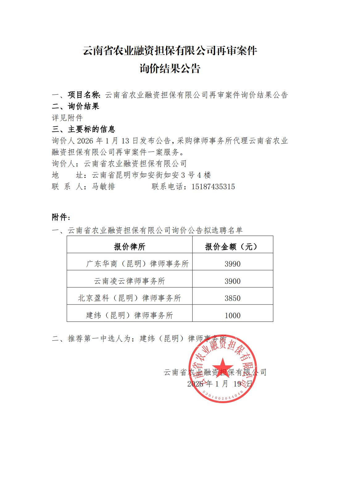 云南省農(nóng)業(yè)融資擔(dān)保有限公司再審案件詢價(jià)結(jié)果公告