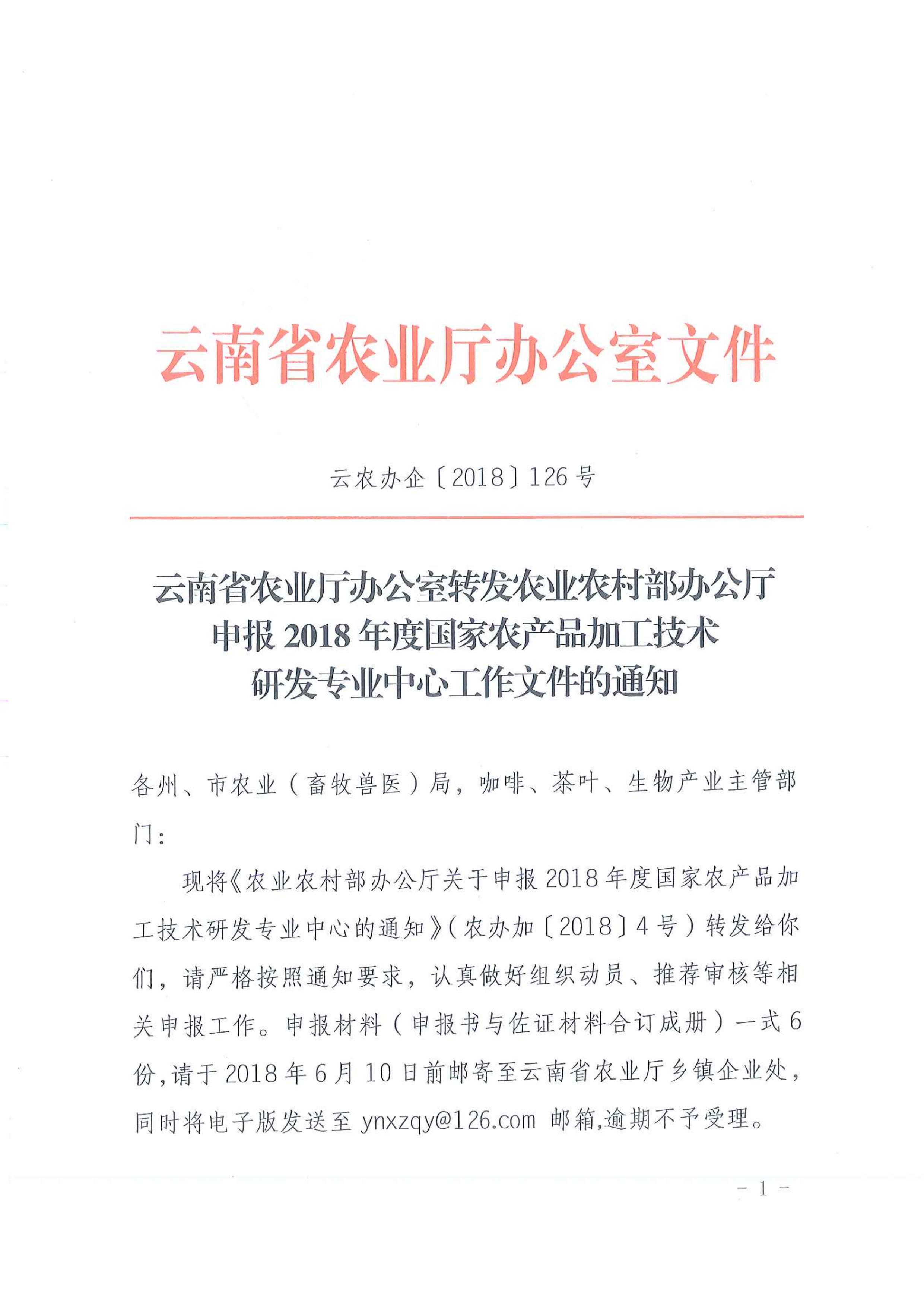 云南省農(nóng)業(yè)廳辦公室轉(zhuǎn)發(fā)農(nóng)業(yè)農(nóng)村部辦公廳申報(bào)2018年度國家農(nóng)產(chǎn)品加工技術(shù)研發(fā)專業(yè)中心工作文件的通知