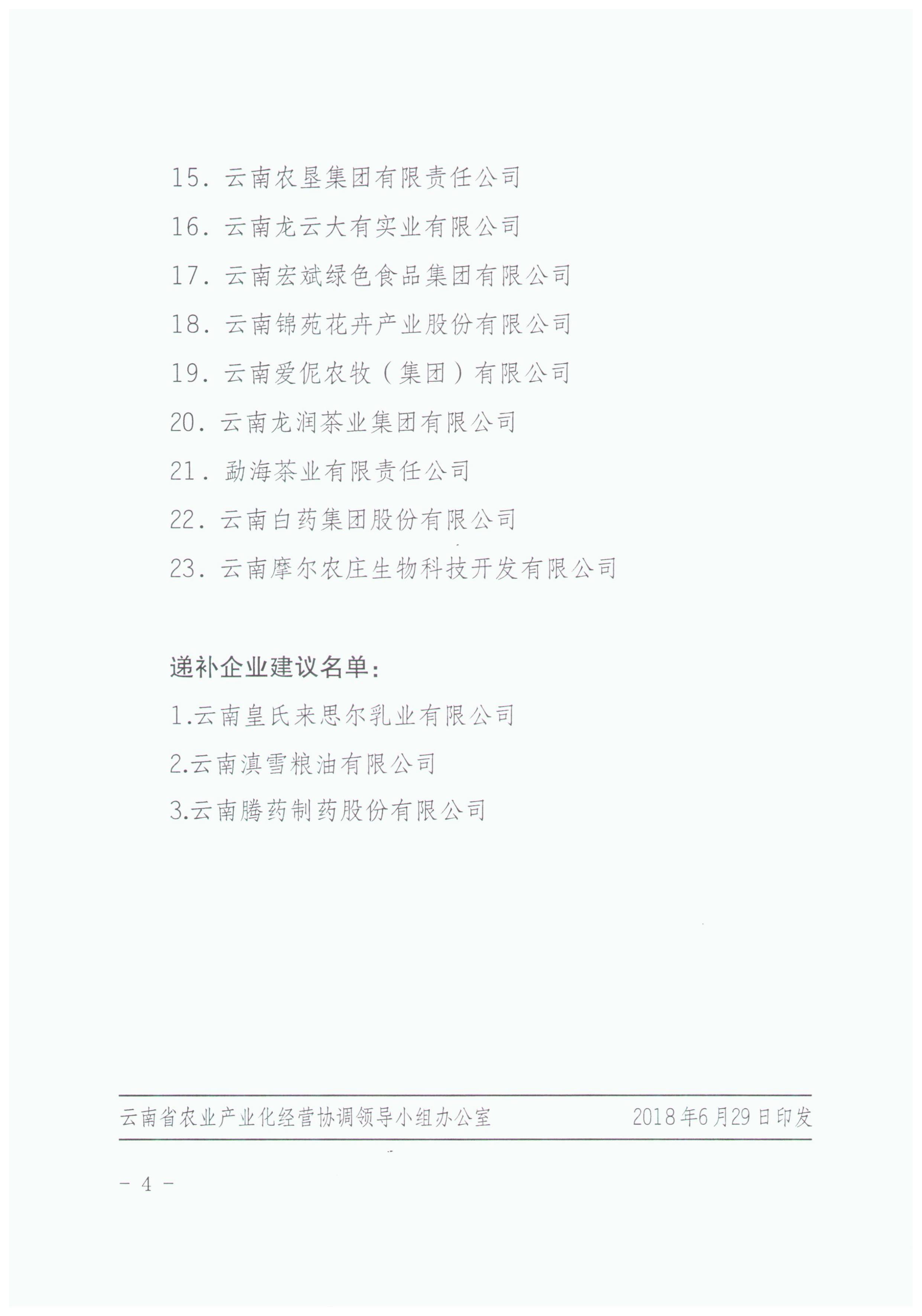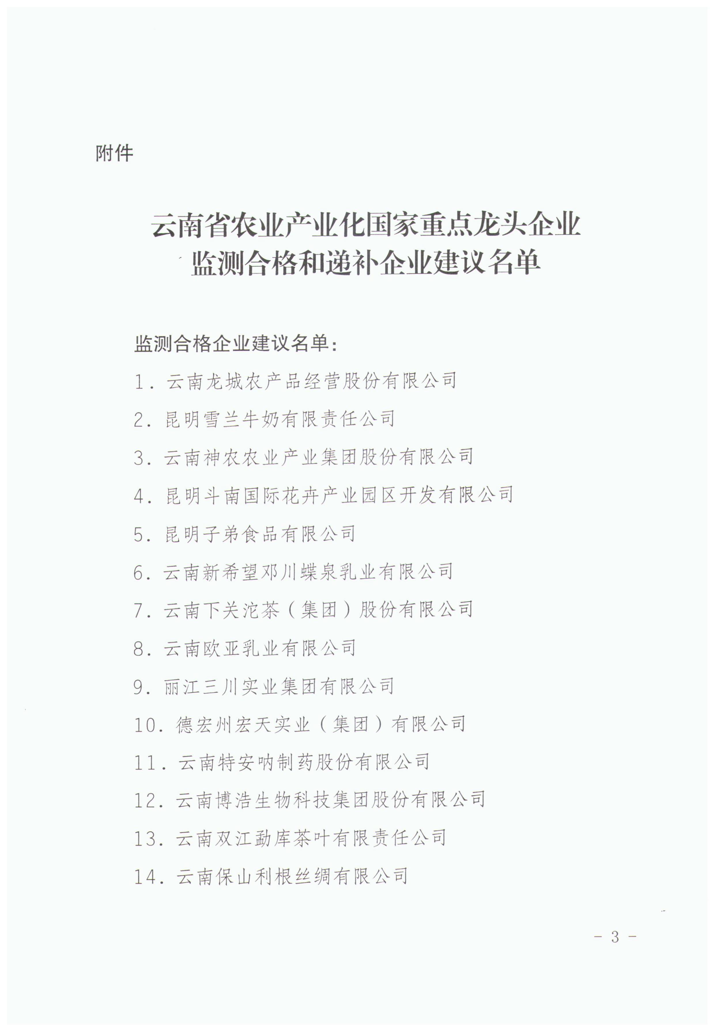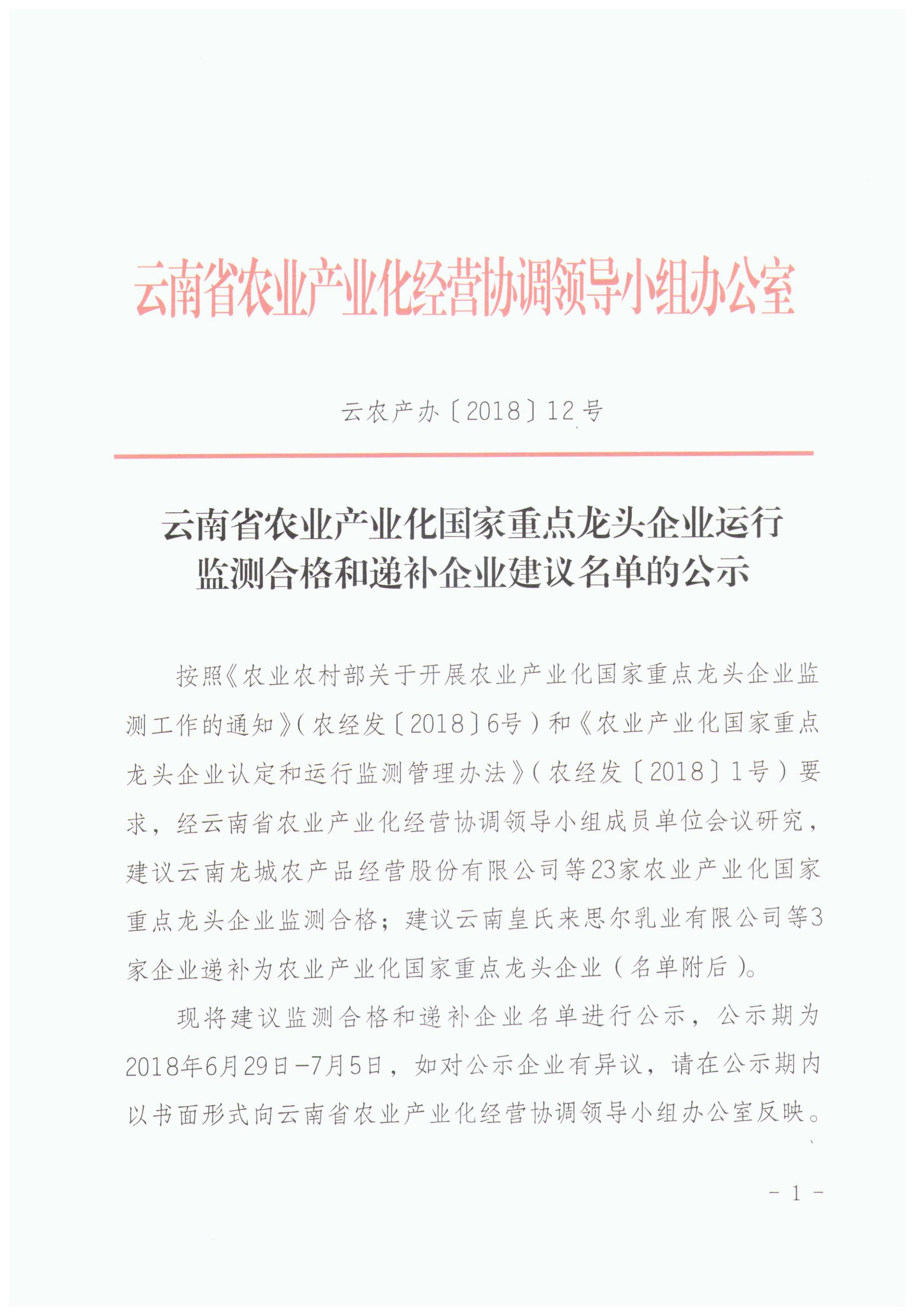 云南省農(nóng)業(yè)產(chǎn)業(yè)化國家重點龍頭企業(yè)運行監(jiān)測合格和遞補企業(yè)建議名單的公示