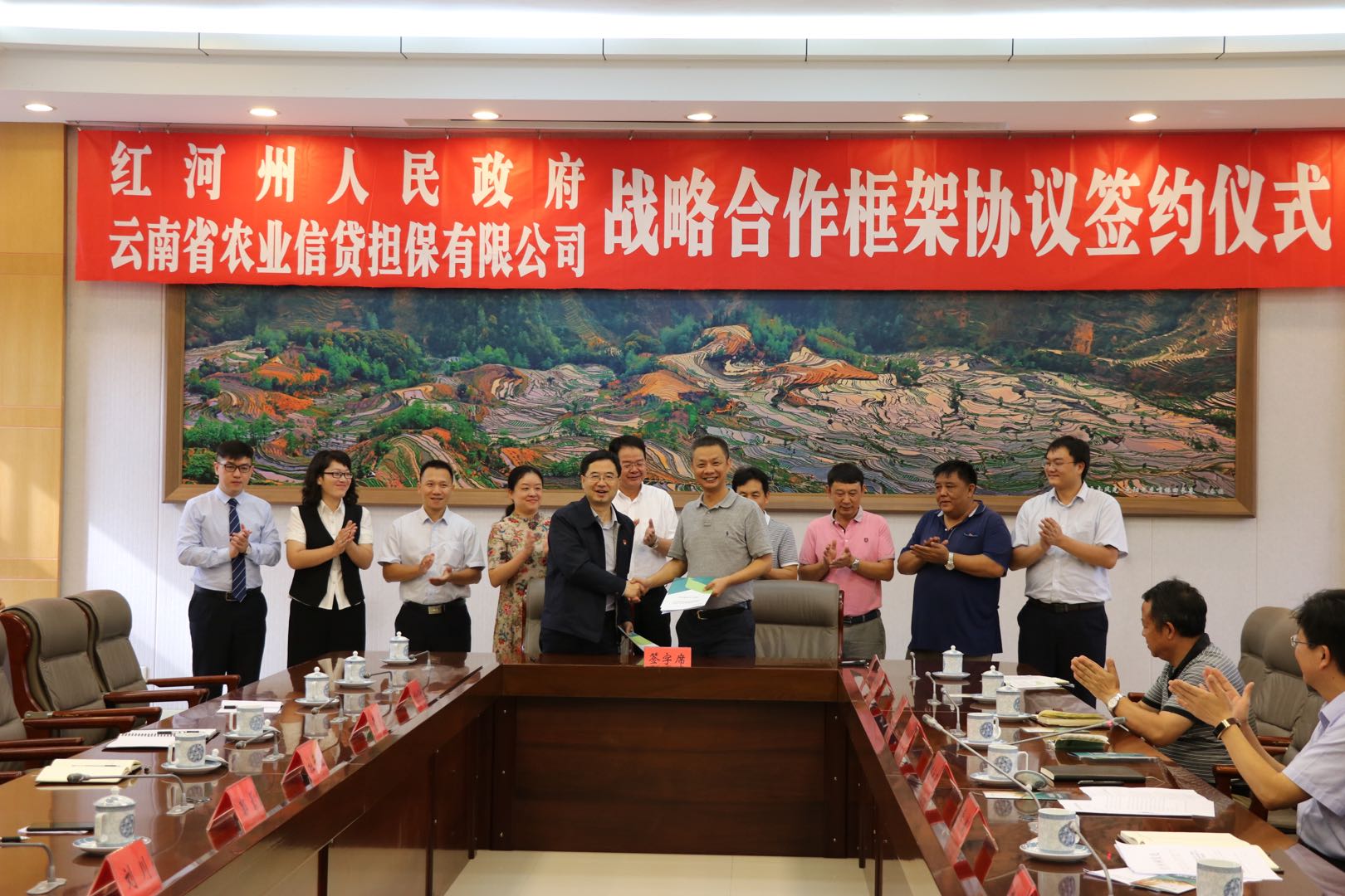 8月21日上午云南省農(nóng)業(yè)信貸擔保有限公司與紅河州人民政府戰(zhàn)略合作協(xié)議簽訂暨公司紅河辦事處、彌勒辦事處授牌儀式在紅河州會堂正式舉行。州人民政府副州長常斌、公司董事長郭影、總經(jīng)理杜開波及紅河州各相關(guān)部門、各銀行金融機構(gòu)及各縣市區(qū)農(nóng)業(yè)、財政部門參加了會議。