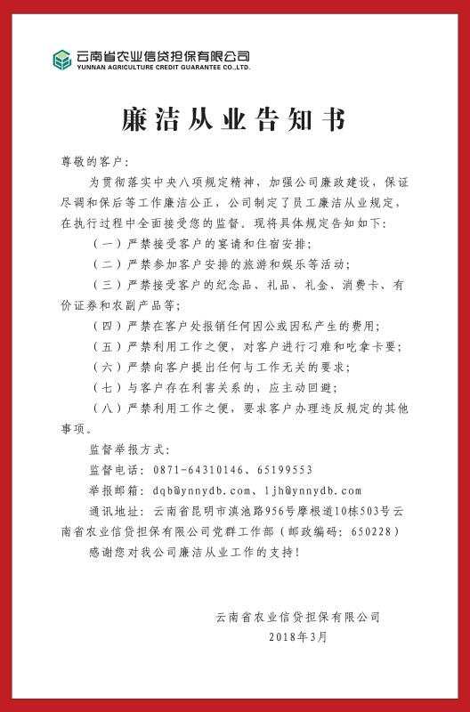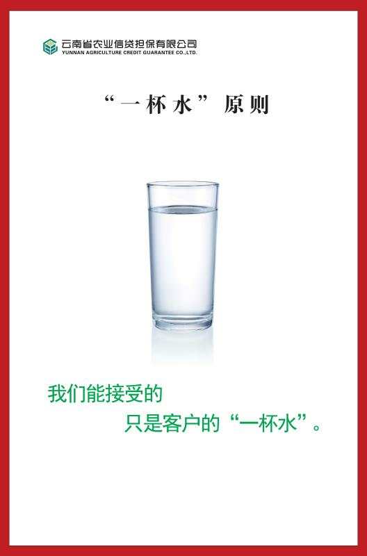 “一杯水”原則和《廉潔從業告知書》制度的實行,將對進一步強化員工的廉潔自律意識和廉潔從業意識,凈化公司廉政環境,加強公司廉政建設,維護公司良好形象發揮積極作用,托起云南農擔服務三農綠色美好愿景,讓云南農擔在實現云南經濟跨越發展和服務三農方面走得更高更遠,發揮更大作用。