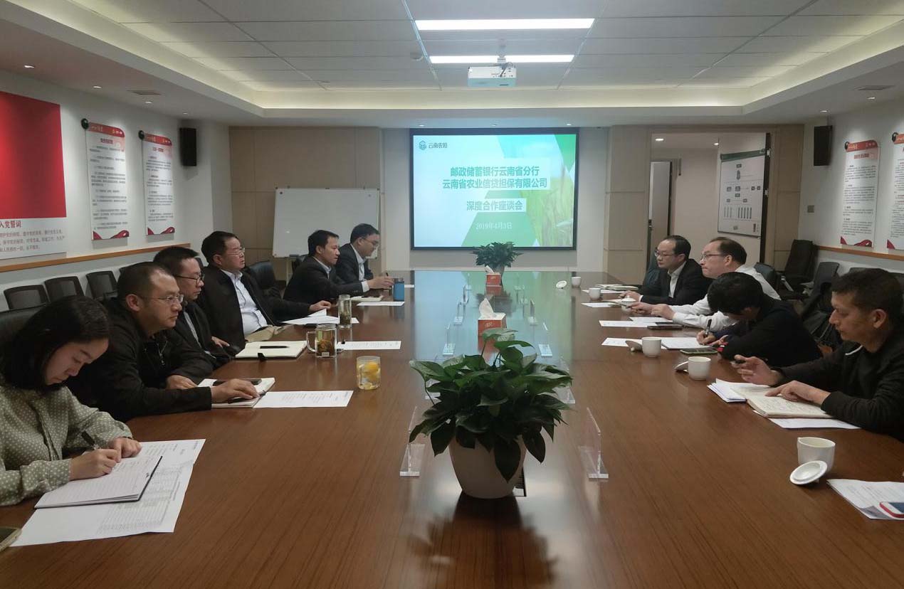 2019年4月3日下午,郵儲銀行云南省分行孟浩副行長率三農(nóng)金融部、授信管理部、小企業(yè)金融中心、公司業(yè)務(wù)部到云南農(nóng)擔(dān)公司座談,公司杜開波總經(jīng)理、廖寅皓副總經(jīng)理及業(yè)務(wù)、風(fēng)控,機(jī)構(gòu)等部門參加座談。會上雙方就業(yè)務(wù)辦理效率及保后監(jiān)管等方面內(nèi)容交換意見,并對下一步工作方向達(dá)成一致。