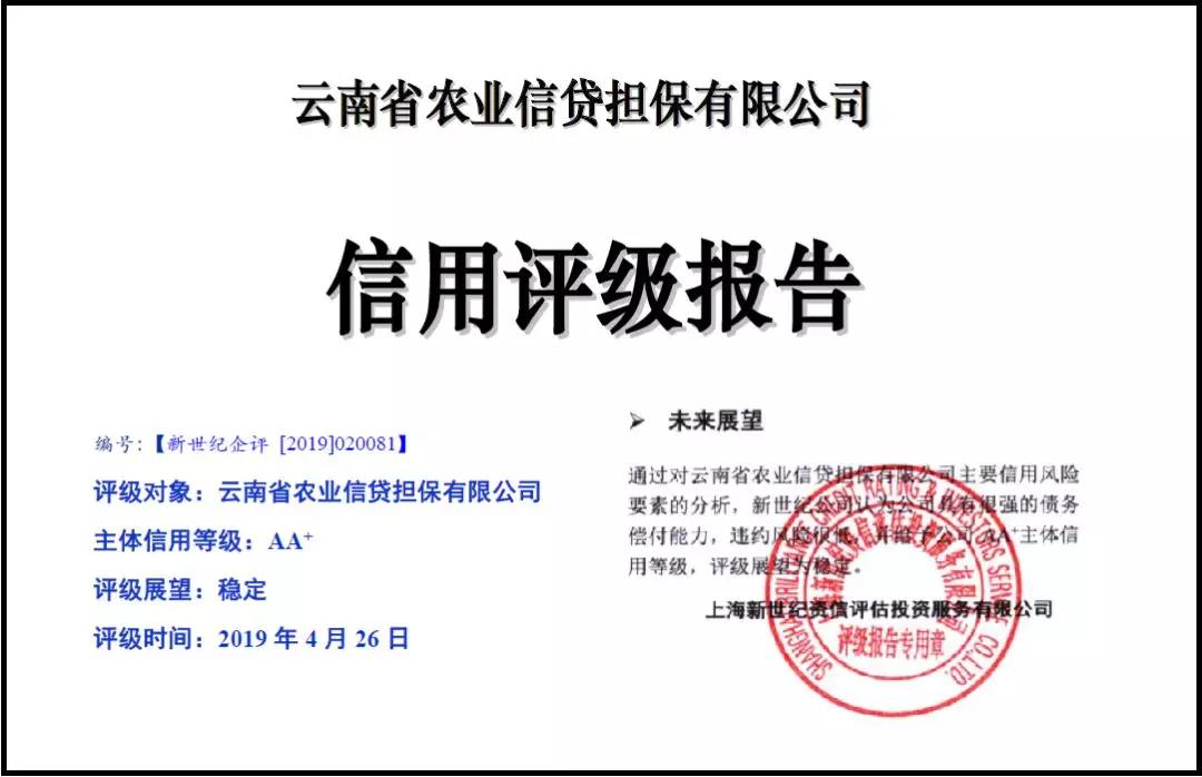 云南省農(nóng)業(yè)信貸擔(dān)保有限公司通過一年的努力,企業(yè)主體信用評(píng)級(jí)在2017年AA等級(jí)的基礎(chǔ)上再上一個(gè)臺(tái)階,2018年主體信用等級(jí)被評(píng)定為AA+,評(píng)級(jí)展望為“穩(wěn)定”,成為自全國(guó)農(nóng)業(yè)信貸擔(dān)保體系組建以來,第一批獲此殊榮的省級(jí)農(nóng)業(yè)擔(dān)保機(jī)構(gòu)。