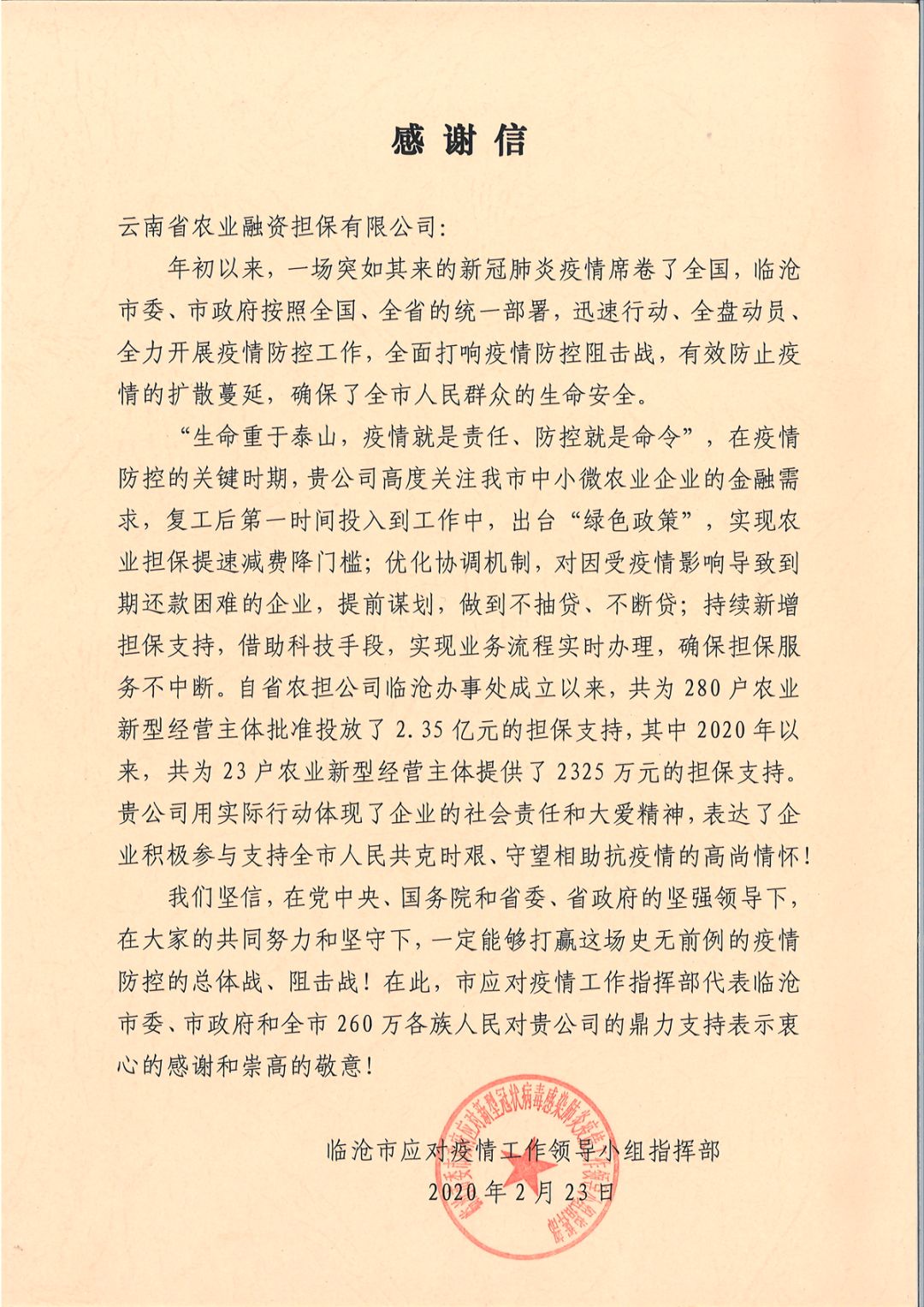 2月23日,臨滄市應(yīng)對疫情工作領(lǐng)導(dǎo)小組指揮部向云南農(nóng)擔(dān)公司發(fā)來致函,對在新冠肺炎疫情期間,公司積極履行職責(zé),為臨滄市新型農(nóng)業(yè)經(jīng)營主體融資需求紓困,表示由衷感謝。今年以來,公司為臨滄市23戶農(nóng)業(yè)新型經(jīng)營主體提供了2325萬的擔(dān)保支持,并在疫情期間出臺(tái)“綠色”政策,積極扶持新型農(nóng)業(yè)經(jīng)營主體共渡難關(guān)。