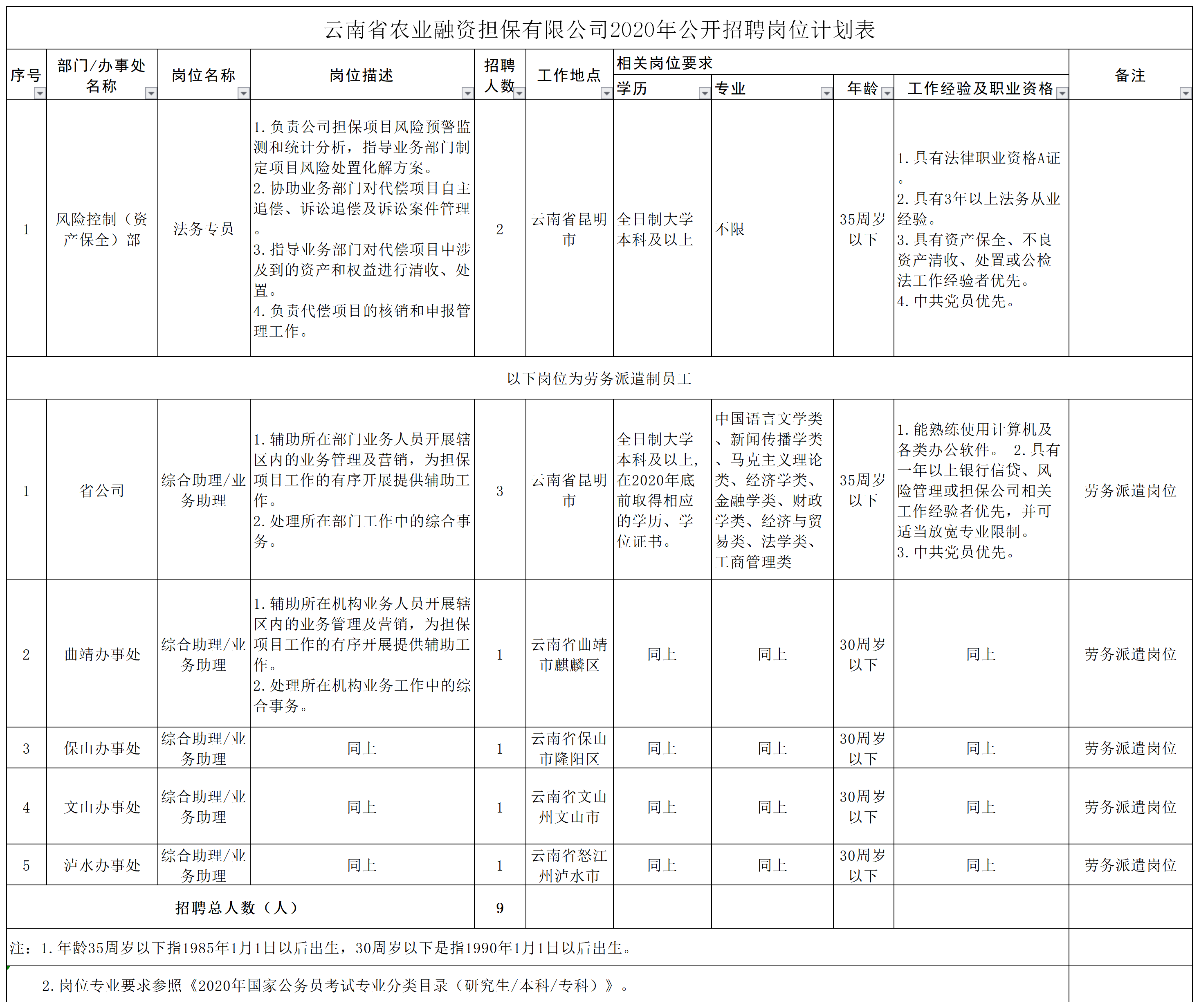 具體崗位及崗位報名條件詳見《云南省農業(yè)融資擔保有限公司2020年公開招聘崗位計劃表》(附件)。