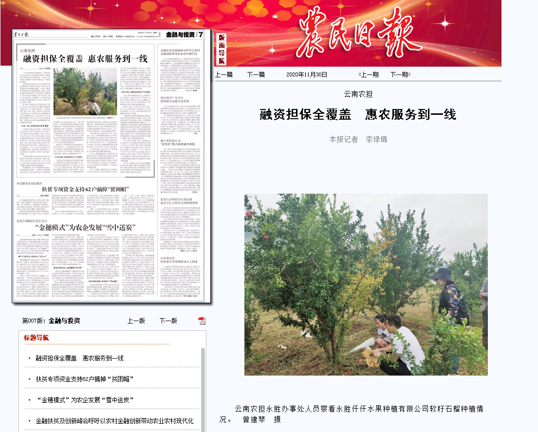 10月,國家農(nóng)擔(dān)公司微信公眾號“農(nóng)擔(dān)經(jīng)驗(yàn)談”專欄中對云南農(nóng)擔(dān)公司認(rèn)真貫徹落實(shí)云南省脫貧攻堅(jiān)等扶貧政策,支持麗江永勝縣農(nóng)業(yè)生產(chǎn)、帶動貧困戶脫貧增收,積極為當(dāng)?shù)匦滦娃r(nóng)業(yè)經(jīng)營主體提供融資擔(dān)保服務(wù)進(jìn)行了宣傳?!掇r(nóng)民日報(bào)》從國家農(nóng)擔(dān)公司了解到云南農(nóng)擔(dān)支農(nóng)惠農(nóng)的相關(guān)情況后,11月30日以《融資擔(dān)保全覆蓋 惠農(nóng)服務(wù)到一線》為題報(bào)道了云南農(nóng)擔(dān)公司成立以來,不斷完善分支機(jī)構(gòu)布局,實(shí)現(xiàn)了機(jī)構(gòu)、業(yè)務(wù)和人員的全面下沉,形成了覆蓋全省的農(nóng)擔(dān)基層服務(wù)網(wǎng)絡(luò)體系,以點(diǎn)帶面、立足當(dāng)?shù)?,為推動縣域經(jīng)濟(jì)和云南高原特色農(nóng)業(yè)產(chǎn)業(yè)發(fā)展、推進(jìn)農(nóng)業(yè)供給側(cè)結(jié)構(gòu)性改革、助力脫貧攻堅(jiān)、助推“鄉(xiāng)村振興”戰(zhàn)略實(shí)施發(fā)揮了積極作用。