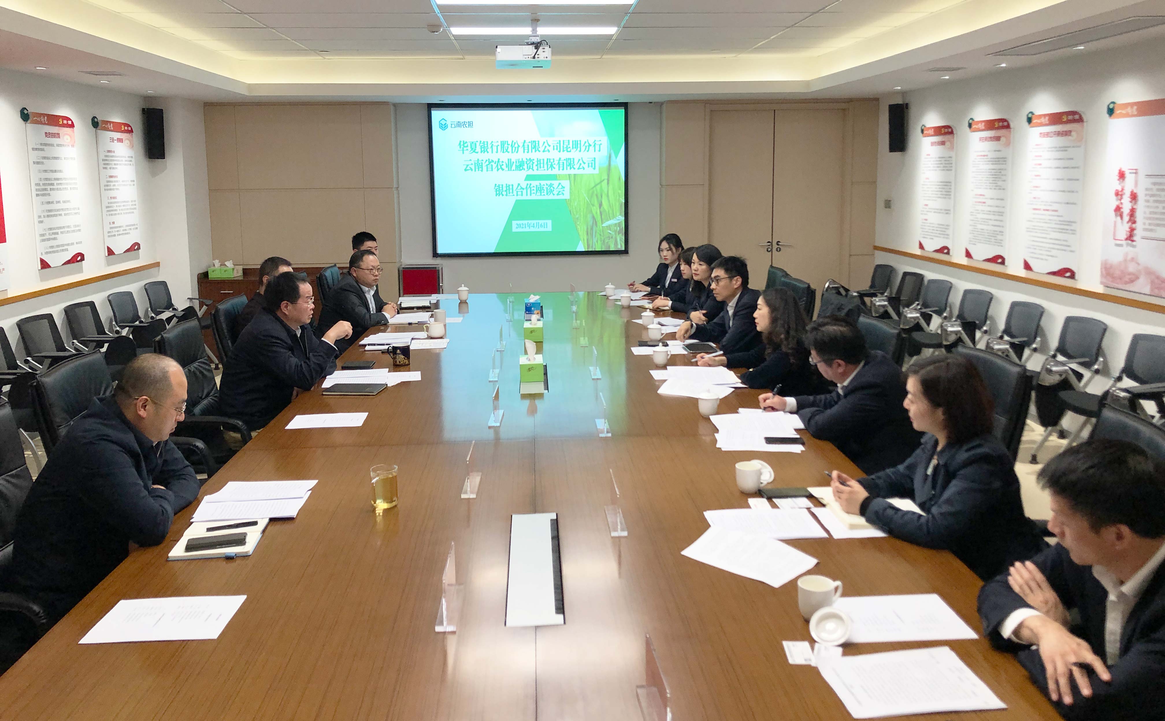 4月6日,云南農(nóng)擔(dān)與華夏銀行昆明分行召開銀擔(dān)合作座談會。華夏銀行季少青副行長攜授信審批部、普惠金融部、公司業(yè)務(wù)部、供應(yīng)鏈業(yè)務(wù)金融部和金江支行負(fù)責(zé)人等參加會議。農(nóng)擔(dān)公司董事長杜開波、總經(jīng)理李世偉、副總經(jīng)理廖寅皓,業(yè)務(wù)發(fā)展部、風(fēng)險控制部、戰(zhàn)略發(fā)展部和昆明專營中心負(fù)責(zé)人參會。