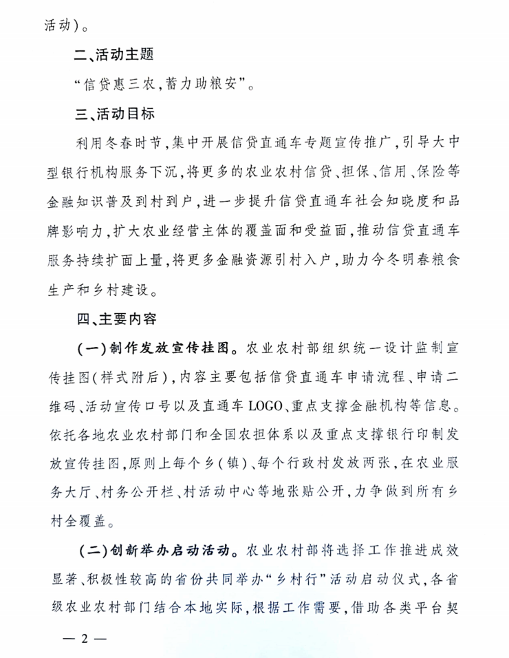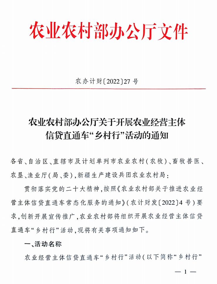農(nóng)業(yè)農(nóng)村部印發(fā)通知開(kāi)展農(nóng)業(yè)經(jīng)營(yíng)主體信貸直通車(chē)“鄉(xiāng)村行”活動(dòng)