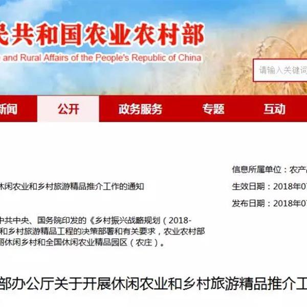 為落實(shí)今年中央一號(hào)文件和中共中央、國(guó)務(wù)院印發(fā)的《鄉(xiāng)村振興戰(zhàn)略規(guī)劃(2018-2022)》關(guān)于實(shí)施休閑農(nóng)業(yè)和鄉(xiāng)村旅游精品工程的決策部署和有關(guān)要求,農(nóng)業(yè)農(nóng)村部決定向社會(huì)推介一批中國(guó)美麗休閑鄉(xiāng)村和全國(guó)休閑農(nóng)業(yè)精品園區(qū)(農(nóng)莊)?,F(xiàn)將有關(guān)事項(xiàng)通知如下。